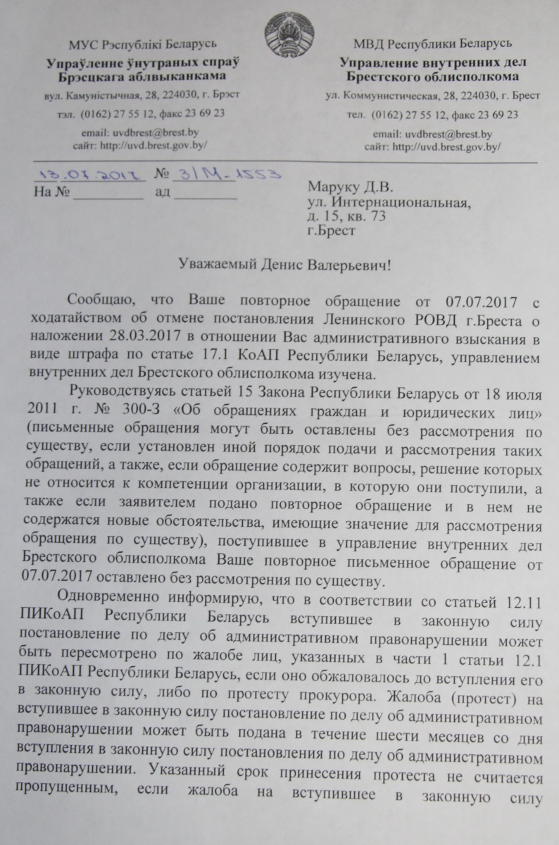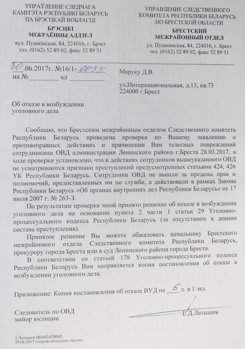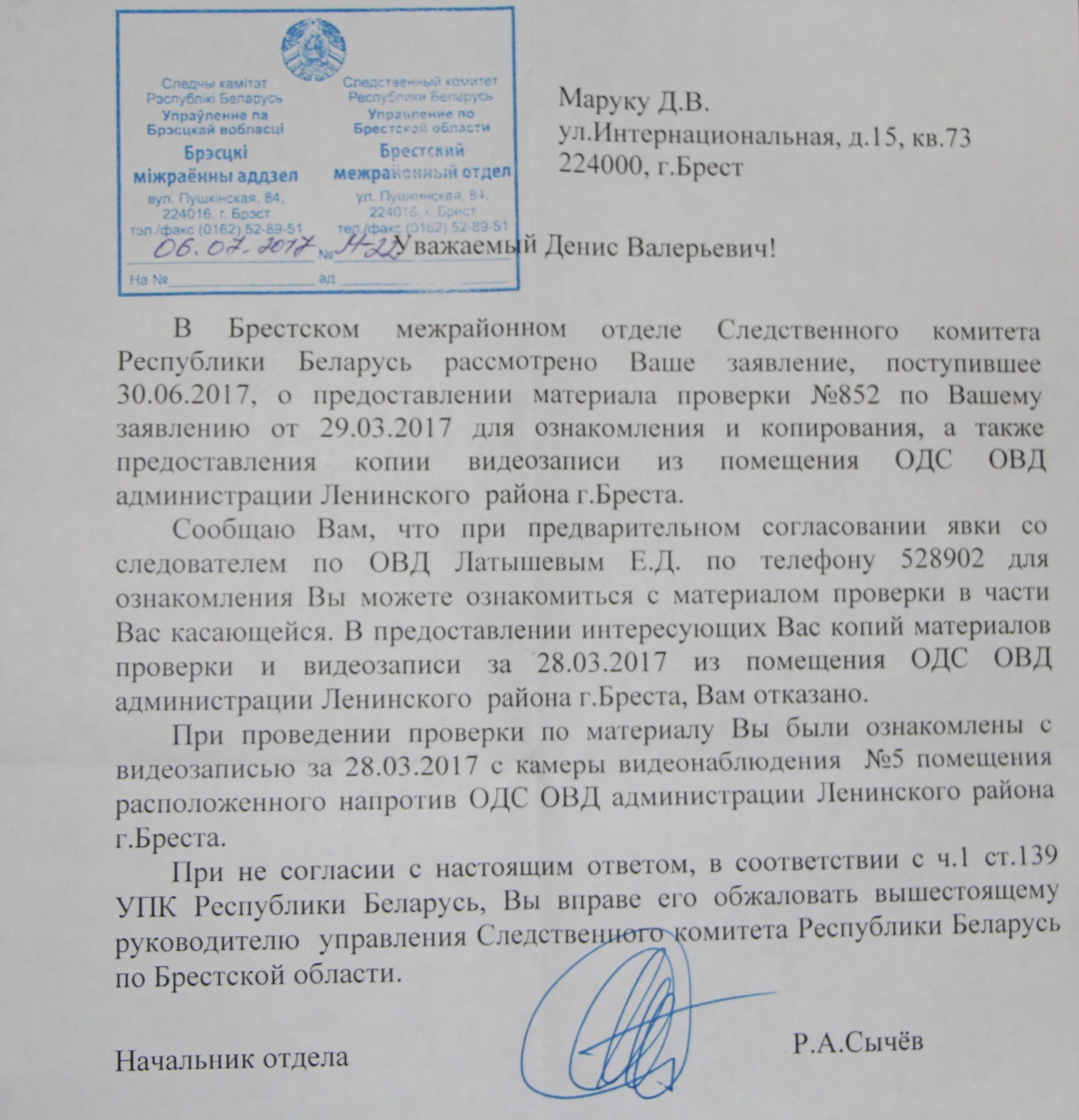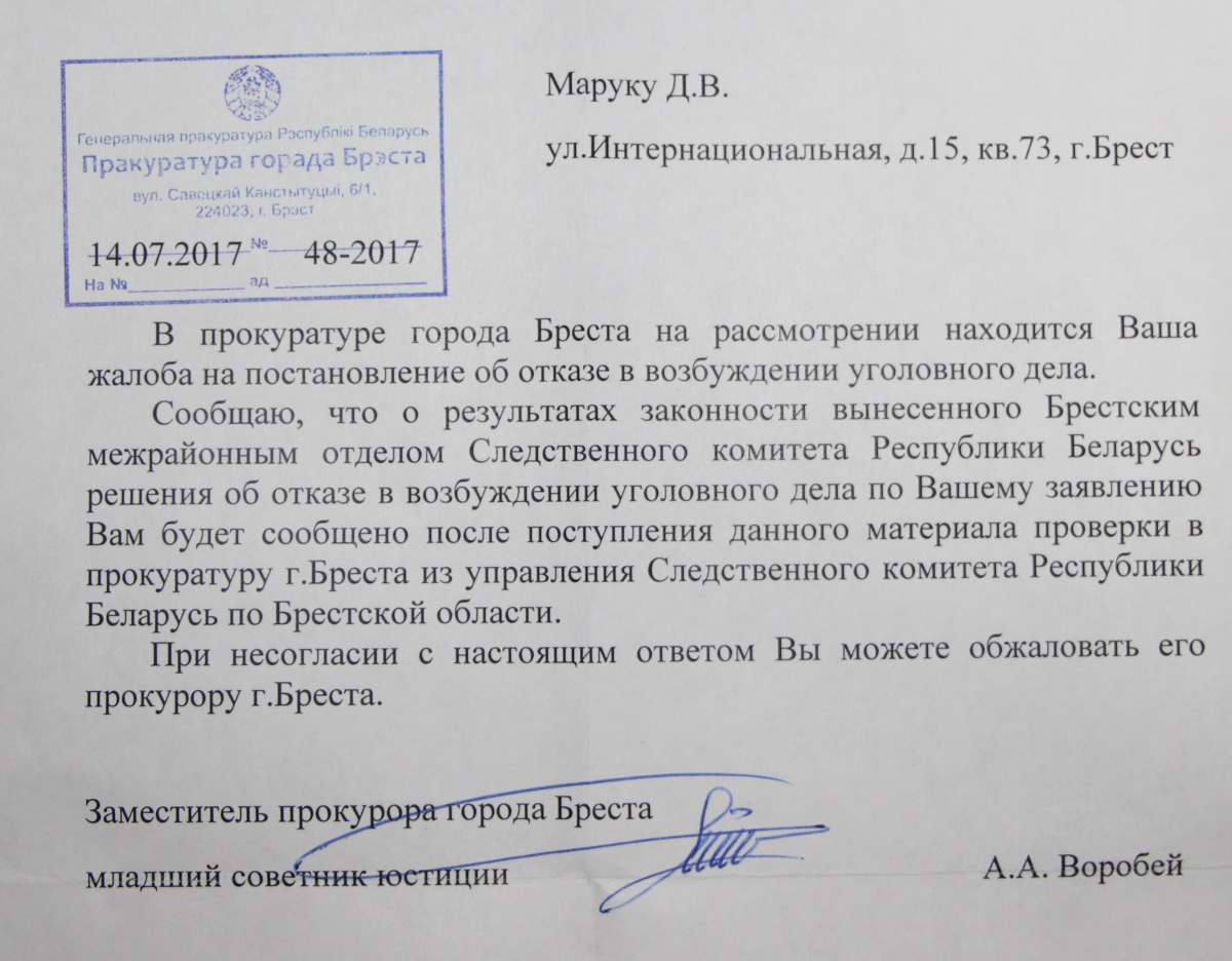 Не буду тратить много букв и вашего внимания на описания всех прений по этому поводу и неоднократные походы в Следственный комитет, унизительные ожидания перед кабинетами, за дверьми которых демонстративно ничего не происходило, либо велись личные беседы по телефону по поводу предстоящего отдыха на выходных. А на замечание о том, что посетителей в кабинете нет и поэтому можно было бы в руки отдать ответ, и вовсе закрывались перед носом двери на ключ. В итоге вместо 29-го июня, спустя три месяца, свой ответ об отказе в возбуждении уголовного дела я забрал 5 или 6 июля в канцелярии, где он случайно завалялся хоть уже и запечатанный в конверт.