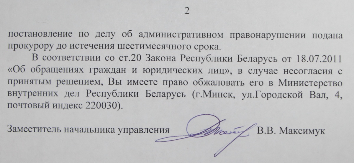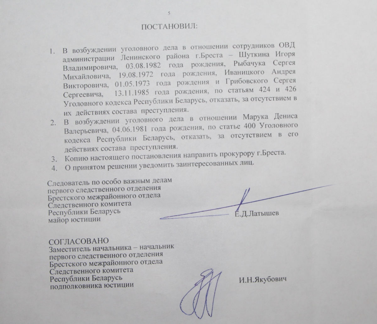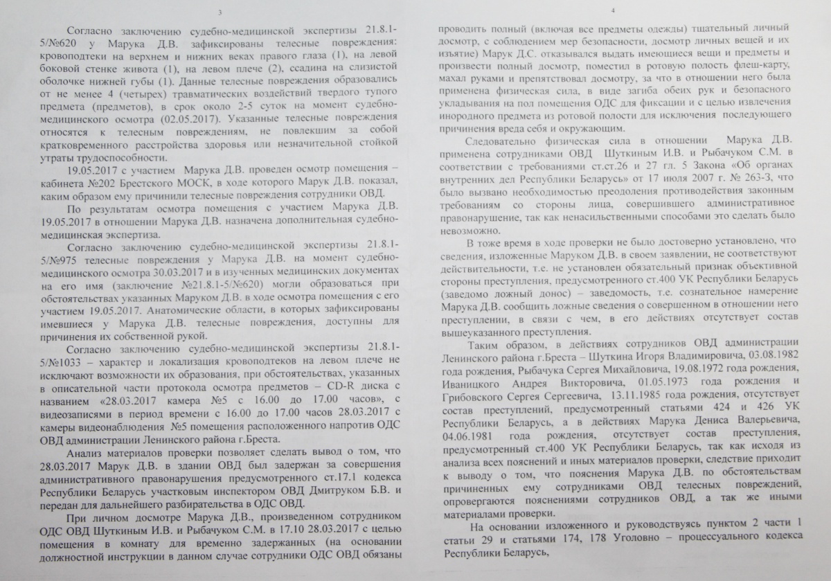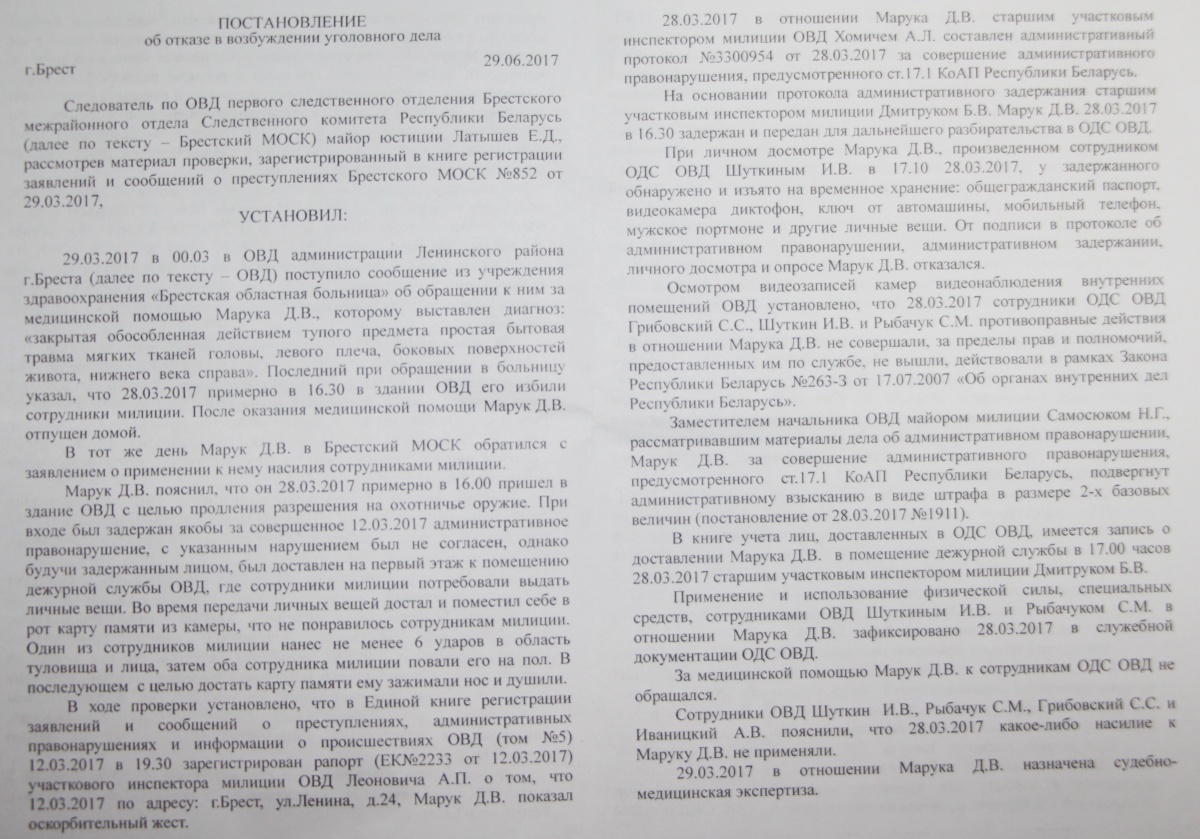 Вот и мой случай яркий пример. И вроде бы как не наврал я, коль согласно материалам проверки в возбуждении уголовного дела в отношении меня по статье 400 УК Республики Беларусь отказано за отсутствием в моих действиях состава преступления. И милиционеры меня якобы не били. Кровоподтеки на левом плече не исключают возможности их образования, при обстоятельствах, указанных при задержании. Зато следствие никак не хочет мне ответить на вопрос почему в кадре на видео записи появилась ложка, но при этом отрицает появление других повреждении в области лица и рта, ссылаясь на ст.ст 26-27 гл.5 Закона "Об органах внутренних дел Республики Беларусь" от 17 июля 2007 № 263-З, что было вызвано необходимостью преодоления противодействиям законным требованиям со стороны лица, совершившего административное правонарушение, так как ненасильственными способами это сделать было невозможно. И при этом же согласно заключению судебно-медицинской экспертизы, одна и та же строчка которой копировалась и вставлялась с начала материала проверки в конец почти месяц, анатомические области, в которых зафиксированные имевшиеся у меня телесные повреждения, доступны для причинения их собственной рукой.