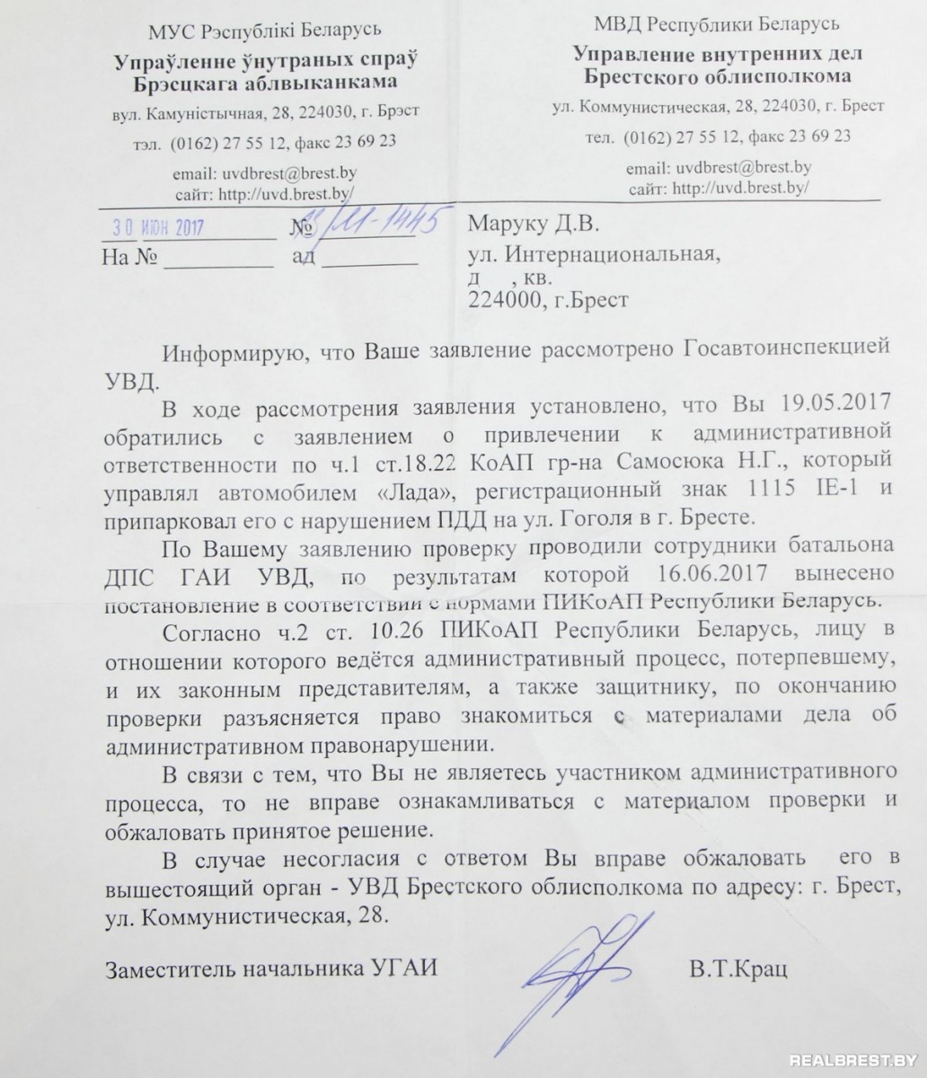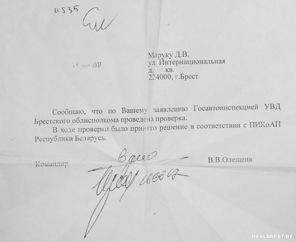 В дежурной части Управления ГАИ, скрепя зубами, мне все таки сделали копию ответа. В.В Олещеня был краток, даже слишком. Мои попытки в личной беседе узнать подробности не имели успеха - командир продолжал молчать.