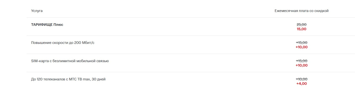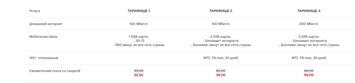 Пользователи могут собрать собственное уникальное предложение в услуге-конструкторе «ТАРИФИЩЕ Плюс», адаптировав тариф под свои потребности. Так, домашний интернет до 100 Мбит/с обойдется в 15 рублей в месяц, безлимитная мобильная связь — 10 рублей за каждый номер, а МТС ТВ — всего 4 рубля.