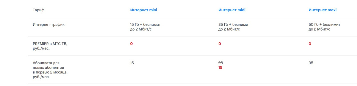 Тарифный план «Интернет midi» включает 35 Гб трафика на максимальной скорости и безлимитный доступ в интернет на скорости до 2 Мбит/с. Дополнительно в подарок абоненты получают бесплатный доступ к онлайн-кинотеатру PREMIER в МТС ТВ.