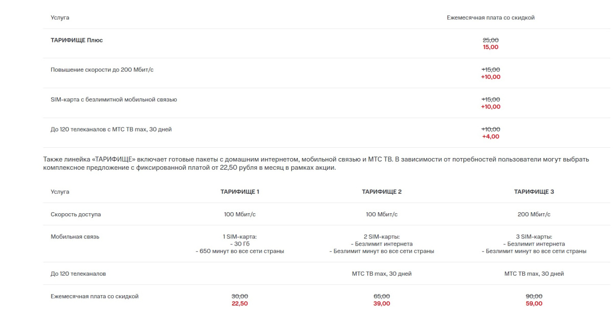 Так, домашний интернет до 100 Мбит/с обойдется в 15 рублей в месяц, а до 200 Мбит/с — в 25 рублей. МТС ТВ будет доступен всего за 4 рубля, а безлимитная мобильная связь — в 10 рублей за каждый подключенный номер.