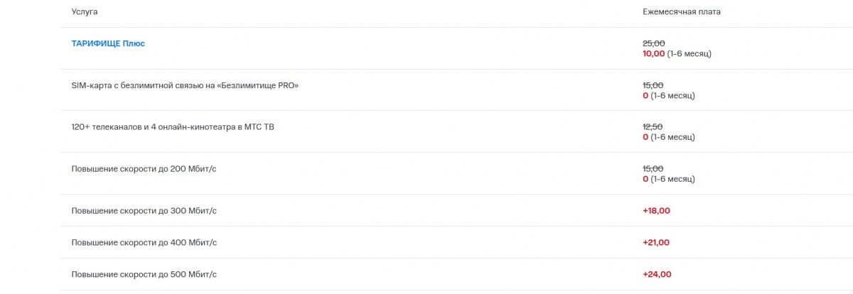 Домашний интернет на скорости до 500 Мбит/с доступен на «ТАРИФИЩЕ Плюс». Услуга-конструктор позволяет самостоятельно выбирать необходимую скорость, а также в любой момент подключать дополнительные опции, не переплачивая за ненужные сервисы. Пользователи могут добавить в единый пакет до 3-х номеров с безлимитной мобильной связью, подписку на МТС ТВ и антивирус Kaspersky.