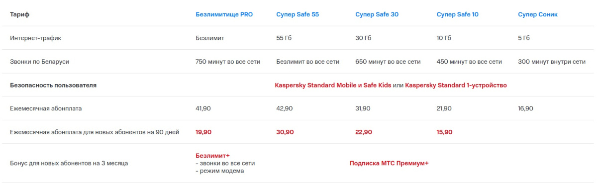 Среди других новинок — тарифы «Супер Safe 10», «Супер Safe 30» и «Супер Safe 55». Они включают нужный объем голосового и интернет-трафика в зависимости от потребностей пользователя. Кроме этого, все новые абоненты смогут 3 месяца совершенно бесплатно читать книги, слушать музыку, смотреть фильмы, сериалы и ТВ, получать приоритетное обслуживание в контакт-центре и скидки на услуги оператора с «Подпиской МТС Премиум+».