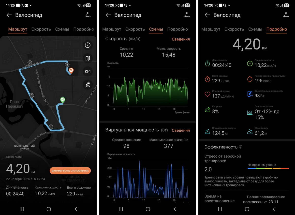 После велопрогулки часы выгрузили подробную статистику о преодоленной высоте, длине маршрута, среднем пульсе, виртуальной мощности и многих других параметрах. Высчитали они и время, которое понадобится на восстановление. В нашем случае это было 10 часов. Профессиональным спортсменам это все определенно будет полезно.