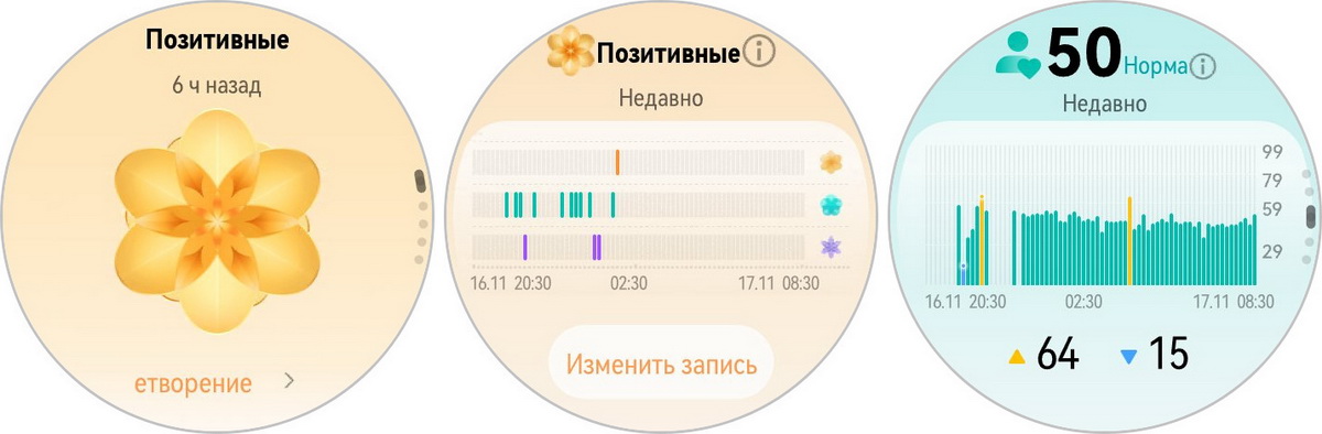 Кроме того, помогают контролировать уровень стресса и эмоциональное состояние. Система анализирует текущие показатели и классифицирует их по 12 типам, отображая информацию на экране в удобной форме. Пользователь может просмотреть статистику за день и воспользоваться дыхательными упражнениями или интерактивными функциями на циферблате, чтобы снизить напряжение. Либо проанализировать свое состояние за неделю, понять, что доставляет наибольший стресс и по возможности убрать этот триггер из своей рутины.