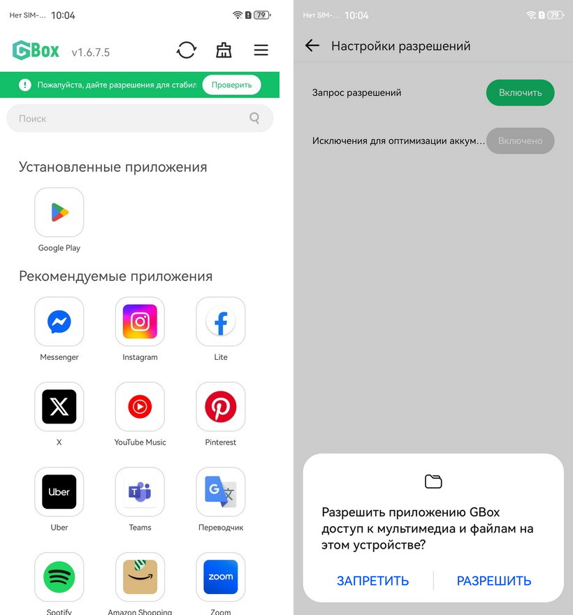 4. Дайте все необходимые разрешения в настройках GBox (ДжиБокс) – чтобы приложения работали, как надо. Бегущая зеленая строка сверху подскажет, где это сделать.