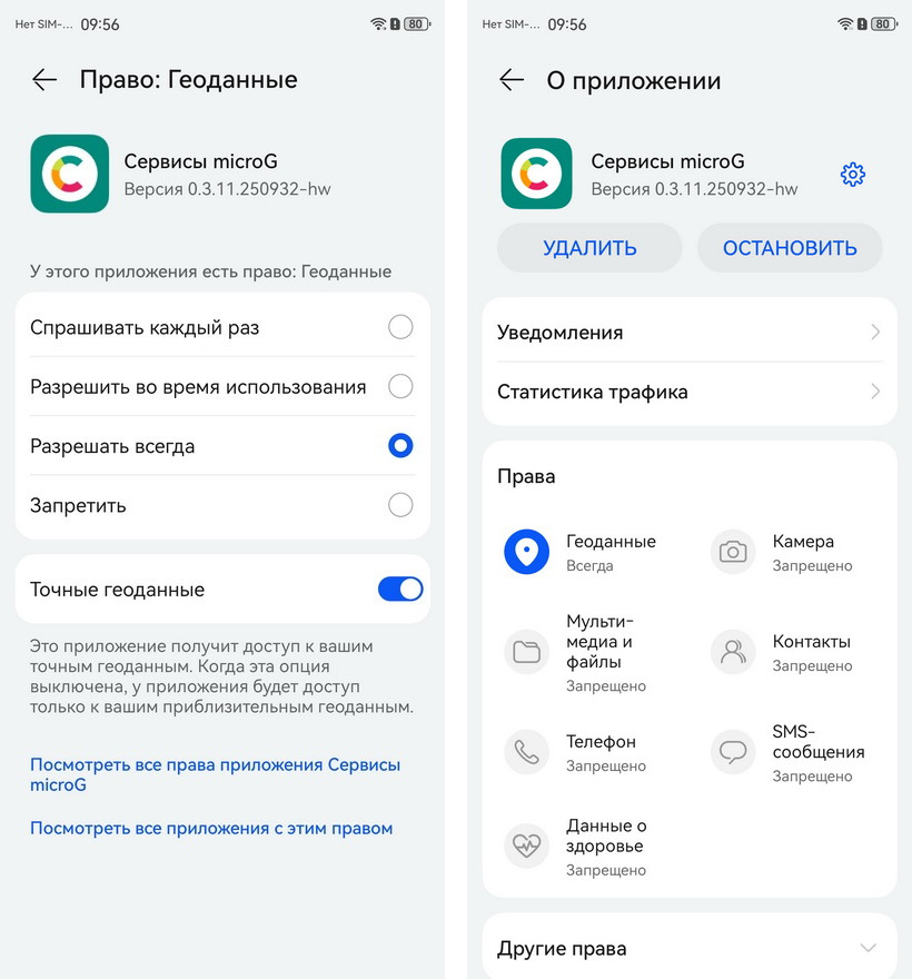 4. После завершения установки откройте «Настройки» смартфона и пройдите путь: «Приложения и службы» → «Приложения» → «Сервисы microG». Здесь в разделе «Права» дайте разрешение на доступ к геоданным, выбрав «Разрешать всегда». Это нужно для корректной работы microG (микроДжи).