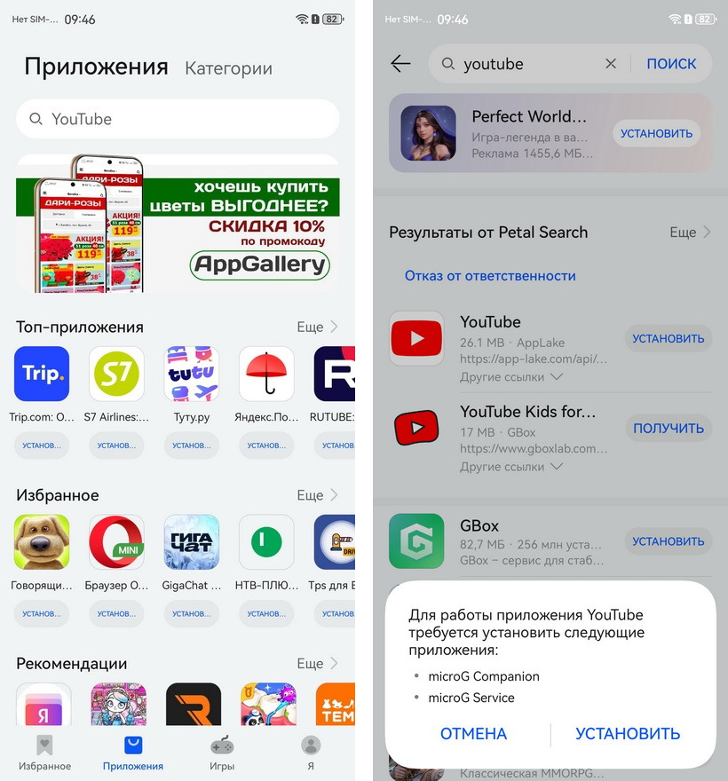 1. Заходите в Huawei AppGallery и вводите название любого приложения Google – например YouTube. Появится кнопка со ссылкой на искомый сервис.
