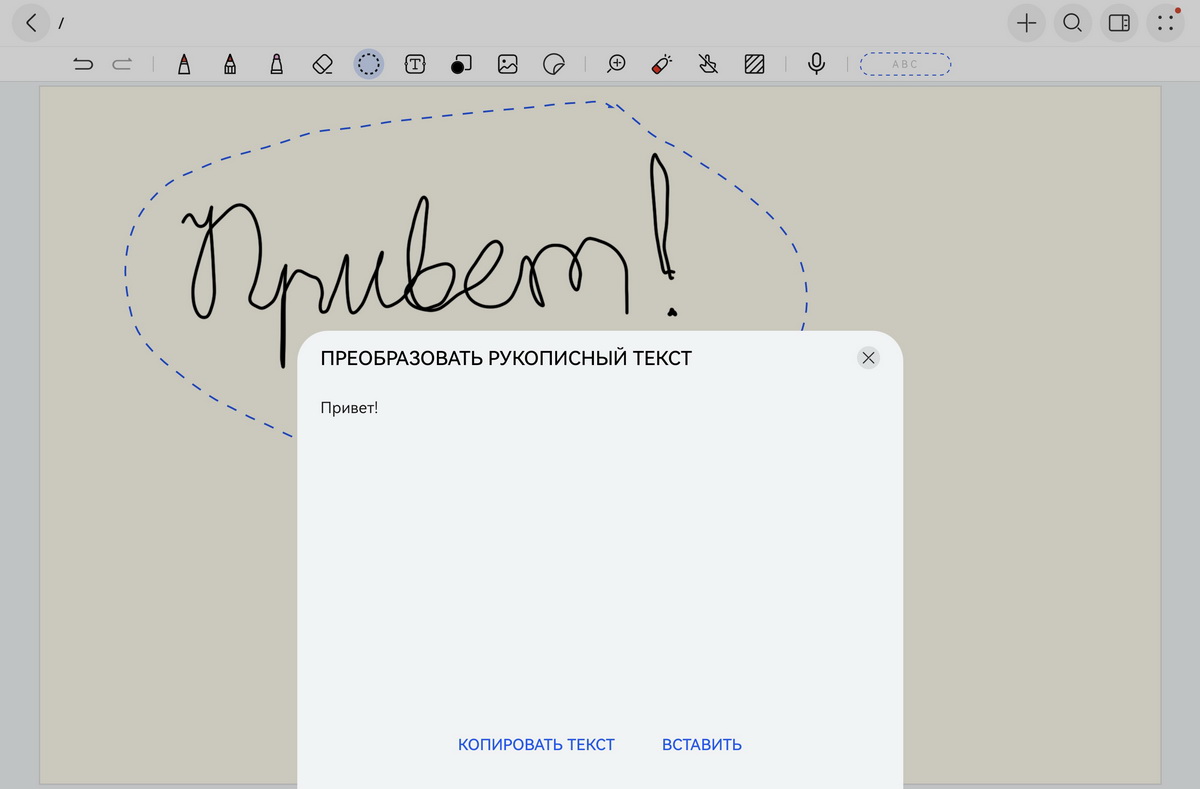 Вводить текст в «Блокнот» с клавиатуры не обязательно – приложение поддерживает работу со стилусом. Причем рукописный текст хорошо распознается благодаря использованию интеллектуальных алгоритмов на базе ИИ. Просто делаем любую беглую запись, обводим ее инструментом «лассо» – и приложение преобразует ее в аккуратный печатный текст, учитывая выбранный пользователем стиль и размер.