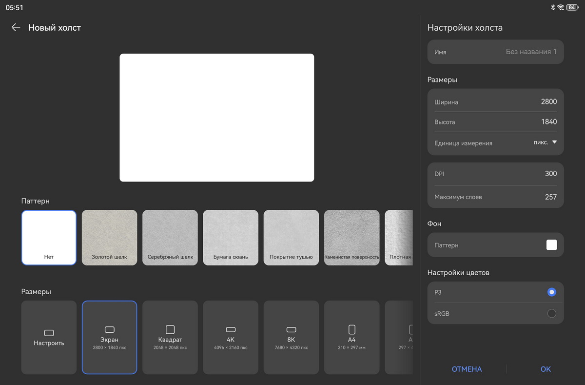 Доступно и большое количество фонов. В качестве холста можно использовать золотистый или серебристый шелк, бумагу сюань, холст под акварель или масло и даже каменистую поверхность. Холсты можно создавать размерами вплоть до 8K, а в настройках цветовой палитры выбирать между P3 и sRGB.