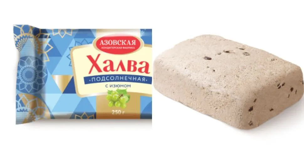 Речь идет о подсолнечной халве с изюмом в полимерной упаковке массой 250 грамм, дата изготовления — 12.04.2025, срок годности — до 12.12.2025. Производитель — «Азовская кондитерская фабрика».