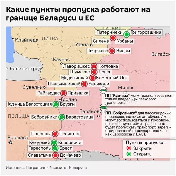 Ночью 17 ноября Польша открыла два пункта пропуска на границе с Беларусью – "Кузница" ("Брузги" с белорусской стороны) и "Бобровники" ("Берестовица"). Все они находятся в Гродненской области. Через "Кузницу" польская сторона пропускает легковые автомобили, автобусы и грузовики, через "Бобровники" – только легковушки.