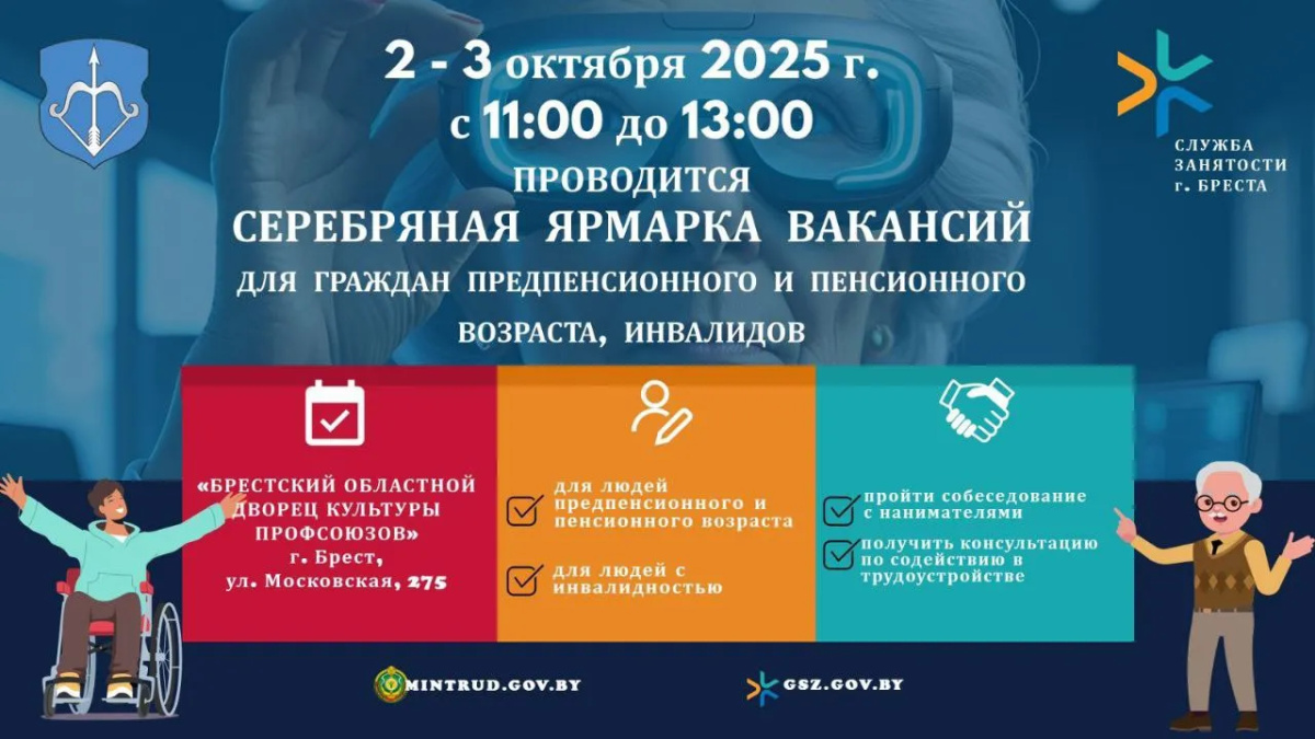 2 и 3 октября с 11:00 до 13:00 в Брестском областном дворце культуры профсоюзов (ул. Московская, 275) пройдет серебряная ярмарка вакансий!