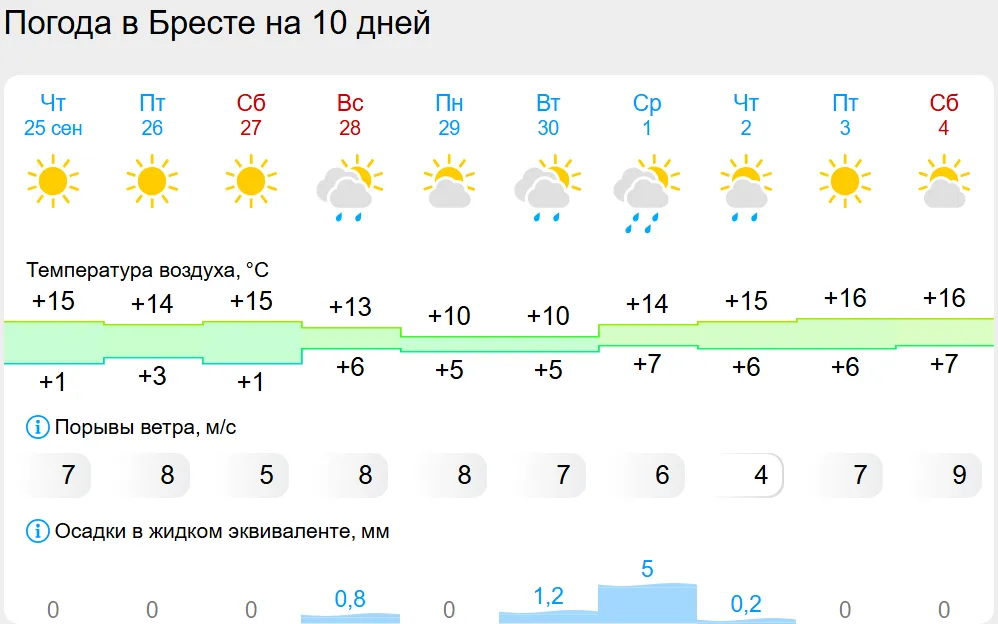 27 сентября (суббота) местами, по югу во многих районах, 29 сентября-1 октября (понедельник-среда) в отдельных районах страны при малооблачной погоде также не исключена вероятность ночных заморозков от нуля до минус 4. На остальной части территории ночные минимумы составят 1-8 градусов тепла. Дневные максимумы окажутся в пределах от плюс 7 до плюс 18 градусов. При этом в течение прогнозируемого периода погодные условия в Беларуси в основном будет определять область повышенного атмосферного давления, поэтому осадков ожидается немного, лишь 27 сентября-1 октября (суббота-среда) под влиянием малоактивных фронтальных разделов в отдельных районах страны пройдут кратковременные дожди. При колебаниях температурного фона в ночные и утренние часы местами по стране будут отмечаться непродолжительные туманы и слабые гололедные явления. В пятницу, 26 сентября, будет без осадков. В ночные и утренние часы в отдельных районах возможен слабый туман. Ночью на большей части территории прогнозируются заморозки от нуля до минус 5, местами температура воздуха составит плюс 1-4 градуса. Днем будет 12-18 градусов выше нуля.
