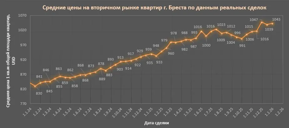 За год квартиры в Бресте подорожали на 11,1% (с $939 за кв.м в начале 2025 года).