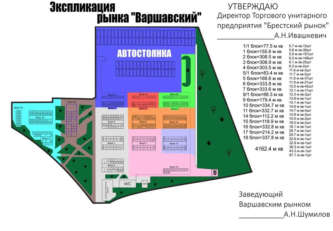 Площадь участка составляет 3,77 га (для размещения объектов розничной торговли). Комплекс состоит из административного здания площадью 425 квадратов, 18 торговых блоков площадью от 77 до 377 квадратов.