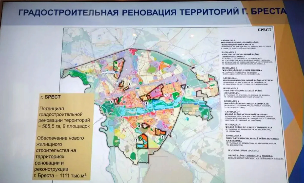 Как следует из презентации директора института, под реновацию могут попасть 47 площадок в областных центрах, в том числе в Бресте – 9, в Витебске – 7, в Гродно – 13, в Гомеле – 12, в Могилеве – 6. Общая площадь жилья, которое там могут построить, – 4,58 миллиона квадратных метров. Предполагается, что больше всего возведут в Гомеле – порядка 1,8 миллиона "квадратов".
