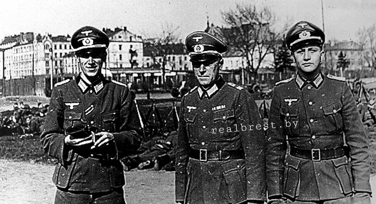 Офицеры из 14-й «противотанковой» роты 133-го пехотного полка. Слева направо: Командир взвода лейтенант Франц Шнейдербауэр, командир роты гауптман Леопольд Вацек, Командир взвода лейтенант Шмюде. Снимок сделан в городе Хотылув(ныне в Люблинском воеводстве Польши) в июне 1941 года