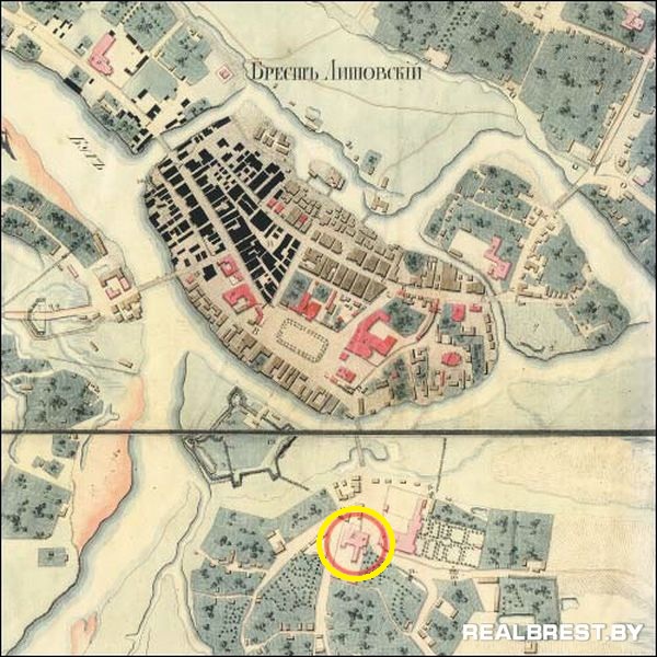 Карта старого Бреста до строительства Бреста, где кружочком обведено местонахдение бердардинских монастырей