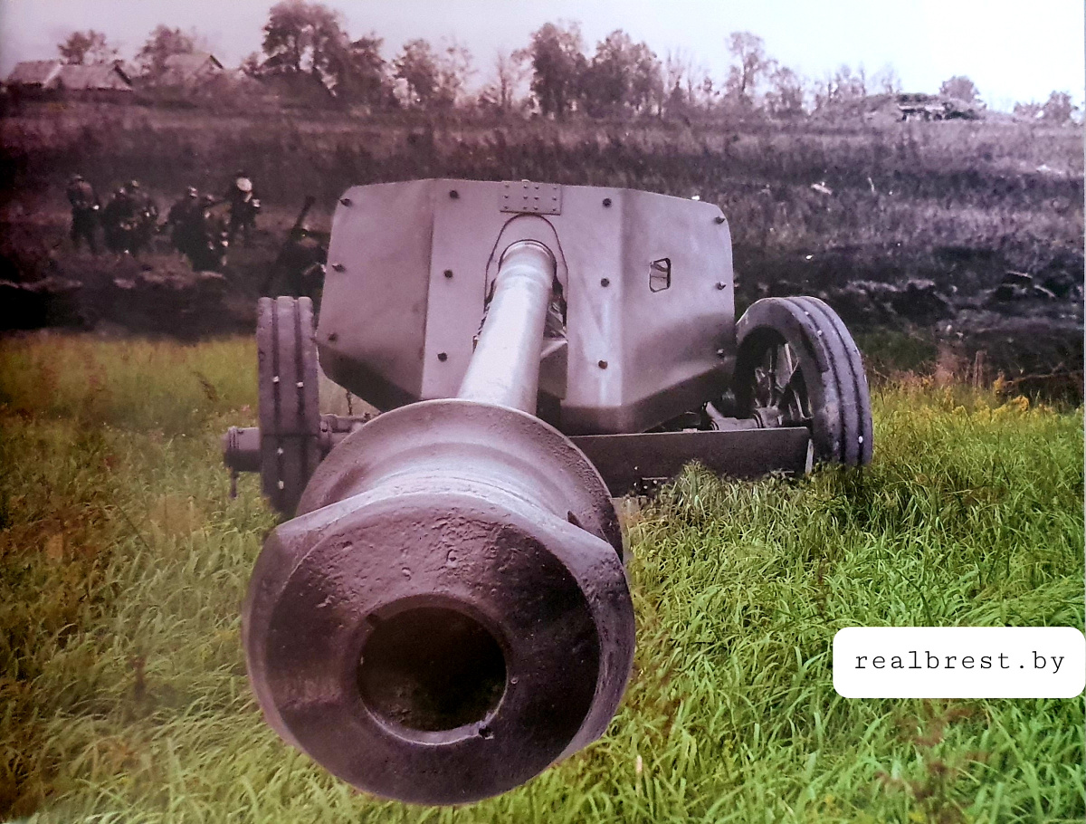 Противотанковое 50-мм орудие PaK 38 на западном берегу Буга: исходная позиция перед часом Х. Архивный снимок совмещен с современным