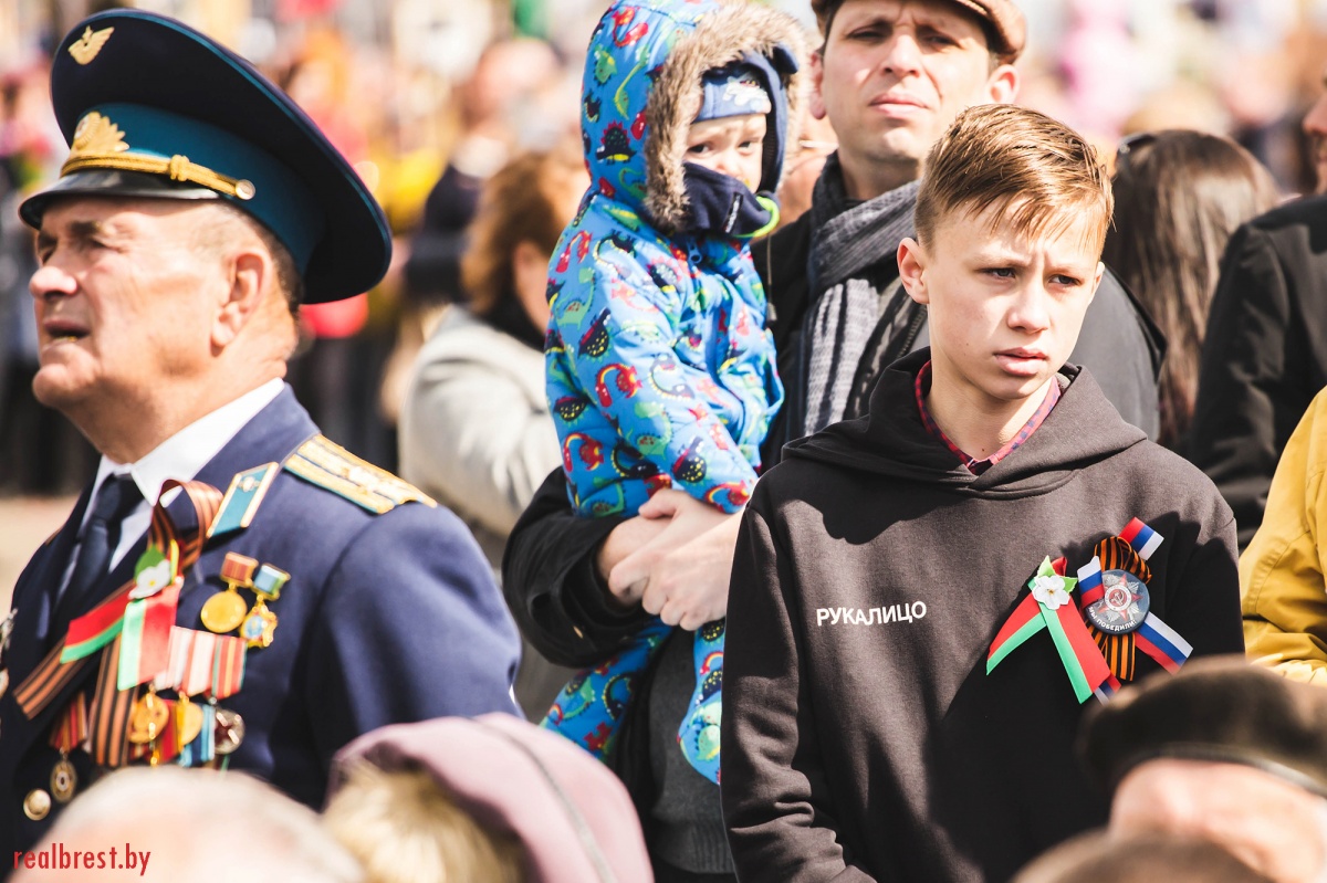 В праздничной колонне шествует и «Бессмертный полк» — в этом году он собрал около 7 тысяч участников из разных городов Беларуси и других стран. Многие брестчане вышли на празднование 9 мая целыми семьями, чтобы отдать дань уважения и памяти защитникам Отечества.