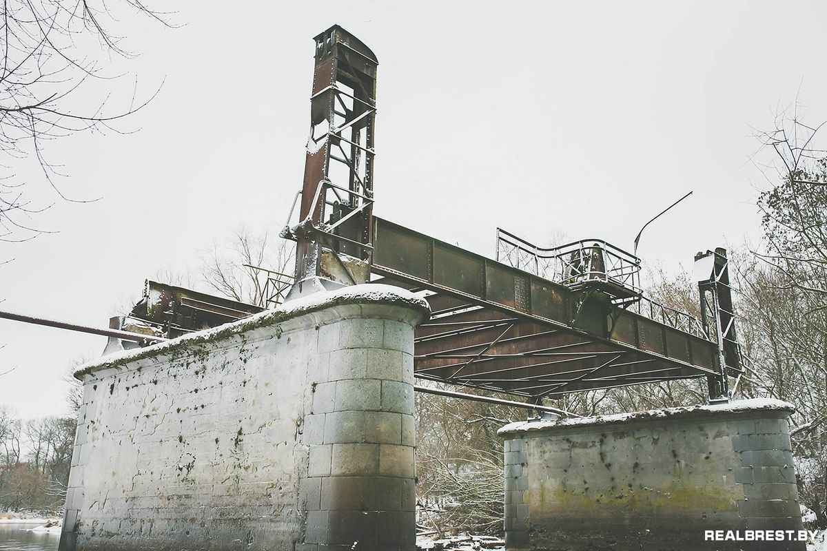Среди вод правого рукава река Мухавец уже более ста лет стоят две железобетонные опоры с металлическими фермами, остатками подъемного механизма и тремя пилонами.