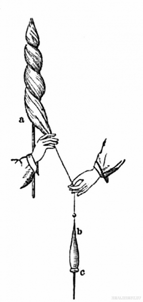 (Прядение с помощью веретена: a — кудель, b — веретено с намотанной на него пряжей, c — пряслице.)