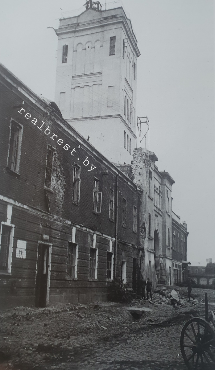 Тереспольская (Саперная) башня — надстройка над одноименными воротами, сделанная во время «Польского» периода истории крепости. В ней располагались жилые помещения (квартиры), а также металлические баки водонапорных резервуаров, поддерживающих давление в местном водопроводе. Верх башни при необходимости выполнял роль наблюдательного пункта. Фото 1939 года