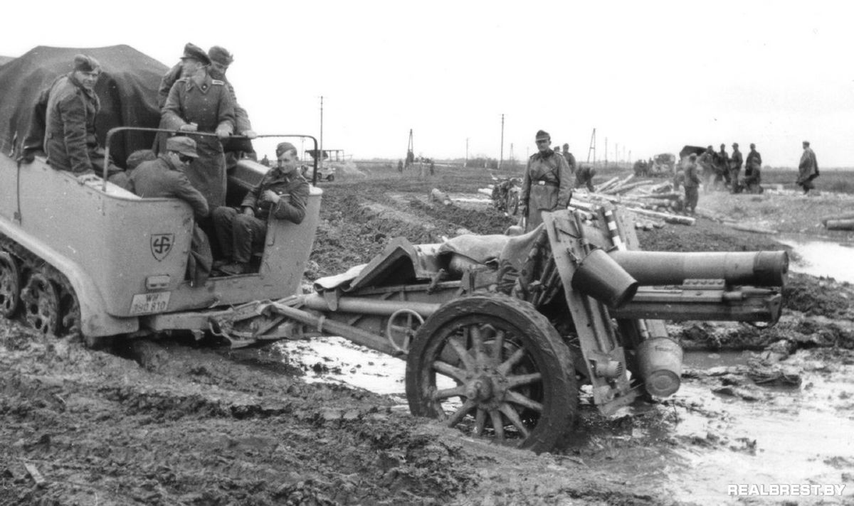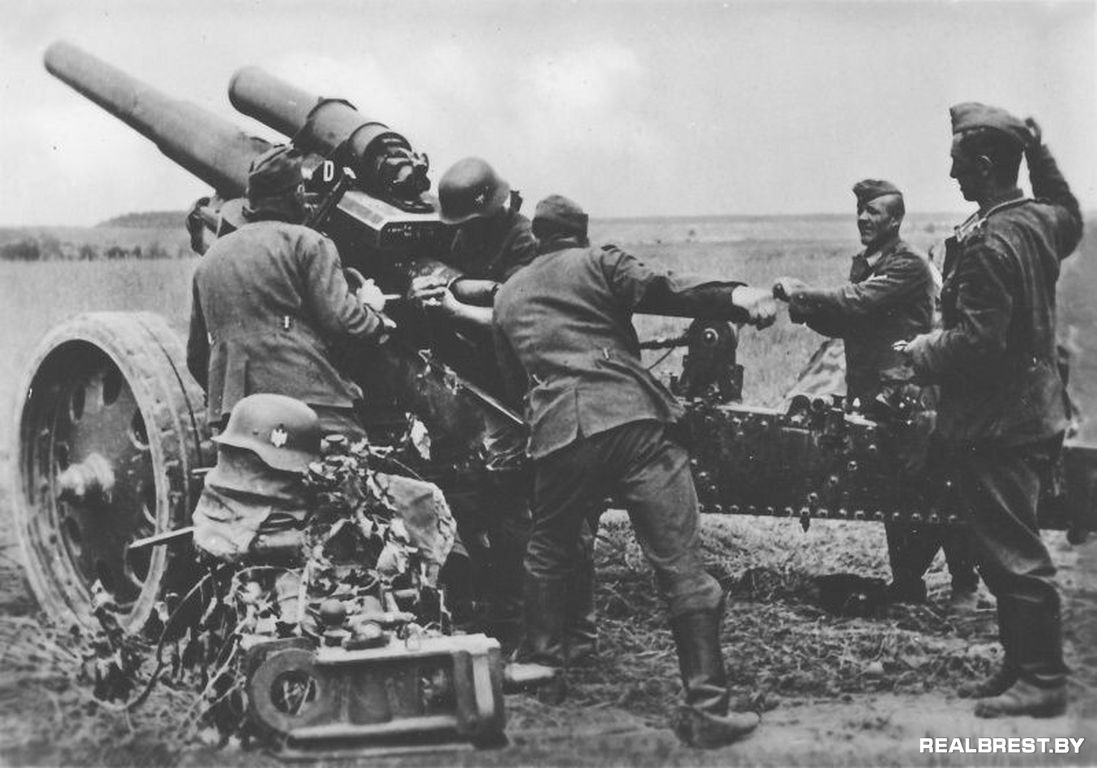 Тяжелая полевая гаубица S.F.Н.18 и ее расчет на огневой позиции. Именно эти орудия впоследствии мелькали в кадрах германской кинохроники, бравурно показывавшей «падение цитадели Брест-Литовска» в еженедельном документальном кинообозрении «Die Deutsche Wochenschau»