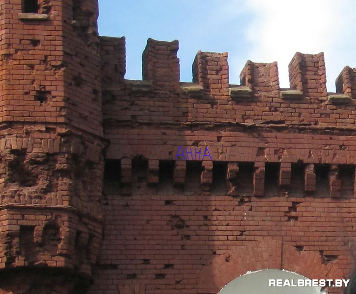 По сути - ворота являются "произведением искусства" каменщиков XIX века. Качество кладки поражает своей точностью и изящностью. Именно здесь,на карнизе Холмских ворот увековечил Карл Иванович имя своей жены.Как вы уже догадались её звали Анна. Пытливый взгляд легко разберётся в посеченных осколками хитросплетениях швов кирпичной кладки.