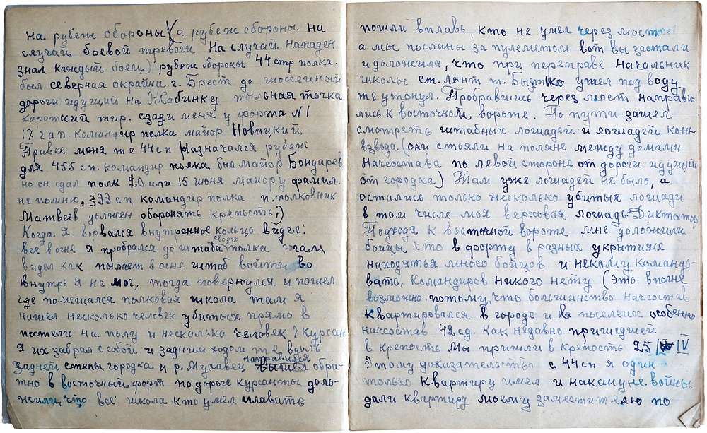 "Думал подкрепиться и прорваться в Беловежскую пущу еще раз через немецкие войска, потому что уже кругом внутри форта, на полянах, и за фортом, вдоль железной дороги, были расположены фашистские войска. Стрельба в форту уже прекратилась. Где-то в отдаленности были слышны одиночные ружейные выстрелы. Тогда я подумал, что крепость занята фашистами, и наши войска не скоро придут. А то все была надежда, что вот скоро придут наши. Прорваться я не успел…"