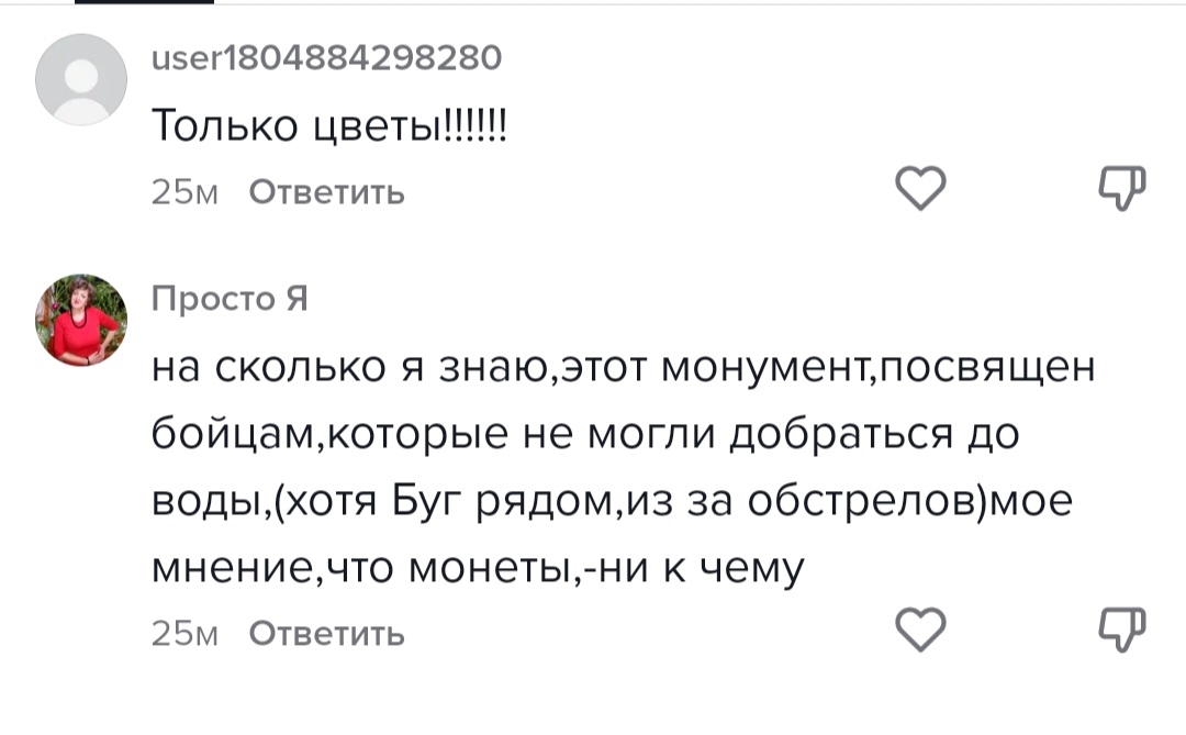 И если к этому месту «возложения» монет у комментаторов претензий меньше, хотя со слов специалистов и работников мемориального комплекса, разменная мелочь оставляет следы окисления, то большинство людей считают, что в каску категорически неприемлемо бросать монеты.