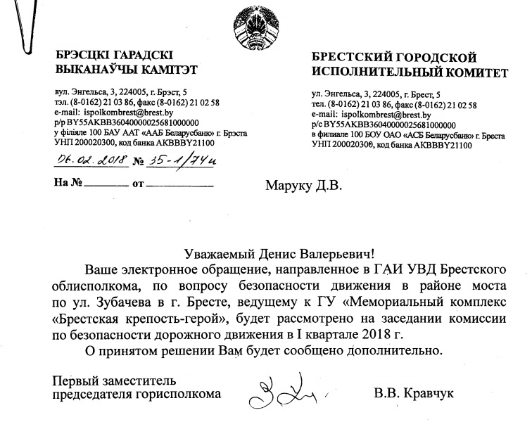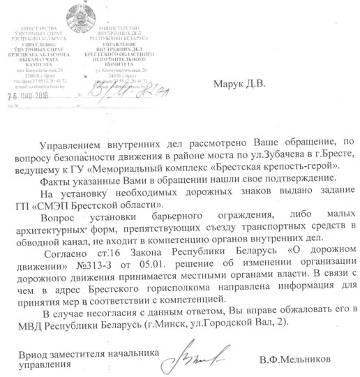 Результатом появления в этом месте дорожного знака стало обращение брестчанина Дениса Марука, который неоднократно с целью обеспечения безопасности туристов, посещающих Брестскую крепость, на данном долгострое обращался в различные организации.