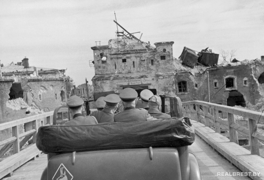 На мосту перед Тереспольскими воротами главный автомобиль кортежа, Mercedes-Benz G4 (класс: внедорожник), ведомый личным шофером фюрера Эрихом Кемпкой. Гитлер и Муссолини спереди и сзади прикрыты адъютантом и офицерами охраны.