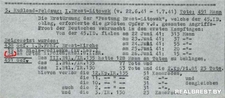 В общем итоге безвозвратные потери только 45-ой дивизии вермахта опять же без учёта потерь приданых подразделений составили 514 человек (Р. Алиев. Штурм Брестской крепости).