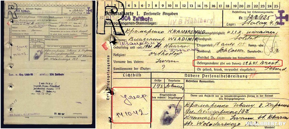 Красным маркером обведена дата пленения (справа) и дата смерти в плену Крамаренко В.И.