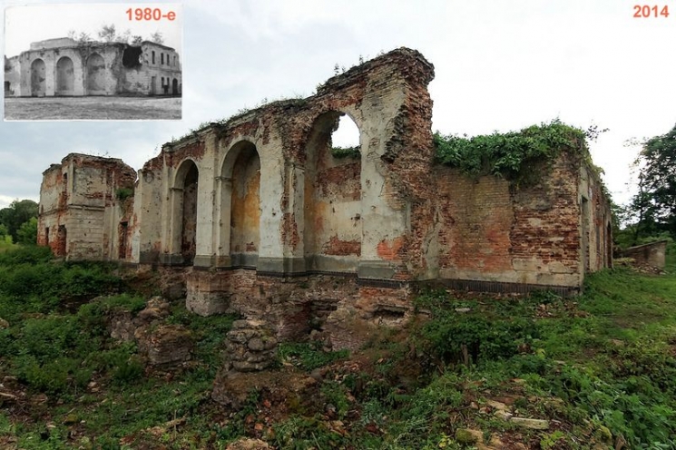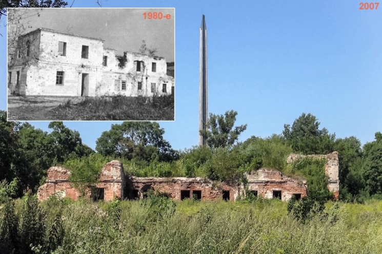 12. В 1980-х годах здание окончательно забросили. Если сравнить советские фотографии с современными, то видно, как сильно разрушились стены второго этажа. Позади виден центр мемориала - штык-обелиск, до него всего 400 м, но здание бывшего госпиталя заброшено и забыто.