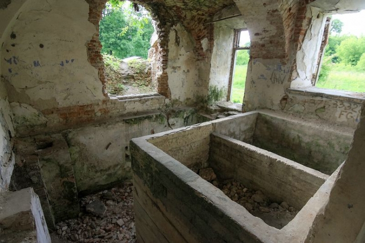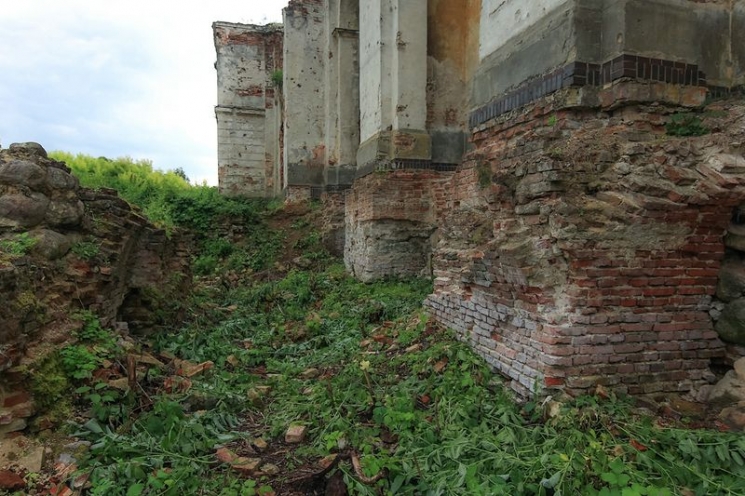 14. От остальной части костёла сохранился лишь фундамент и основания сводов. Для усиления прочности конструкции костёла в подвале была устроена монолитная связь между противоположными устоями свода.