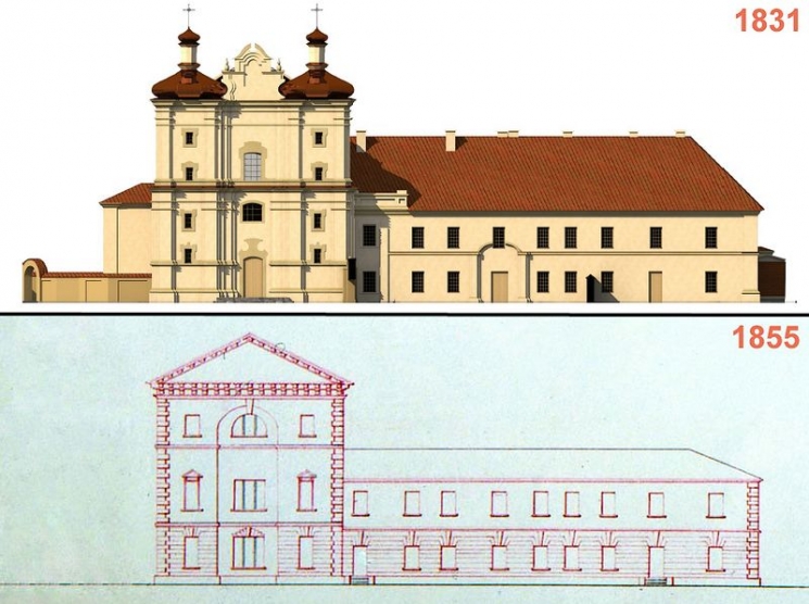 8. Монастырский комплекс был превращён в сооружение казарменного типа с претензией на стиль имперского классицизма. Костёл был перестроен в трёхэтажный корпус с треугольным фронтоном. В крыше келейного корпуса была заменена стропильная система и высота кровли значительно уменьшилась. Перед реконструкцией в 1831 году здание было тщательно обмеряно офицерами генерального штаба, благодаря чему мы точно знаем, как на тот момент выглядел монастырь.