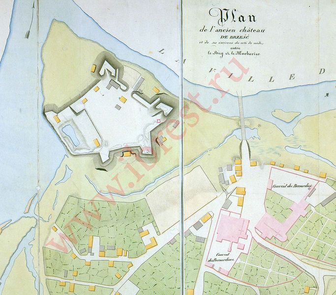 1. В XVII веке Брест состоял из трёх частей: замка, «места» (городских кварталов) и Замуховечья. На карте показаны замок и южное предместье города, Замуховечье. Сразу за мостом находилась площадь, от которой расходились две улицы: Луцкая (или Волынская) и монастырская. На площади стояли два монастыря ордена бернардинцев, мужской и женский.
