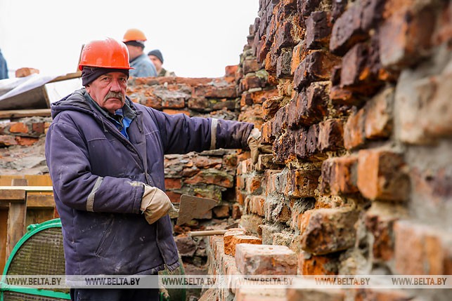 Каменщик филиала "Брестсреставрация" ОАО "Белреставрация" Василий Хмель во время консервации руин Белого дворца на территории мемориального комплекса "Брестская крепость-герой"