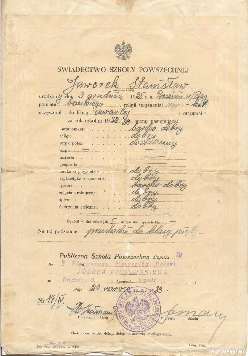 Ведомость об окончании 4 класса Станислава Яворека из семейного архива Юлии Корсунцевой