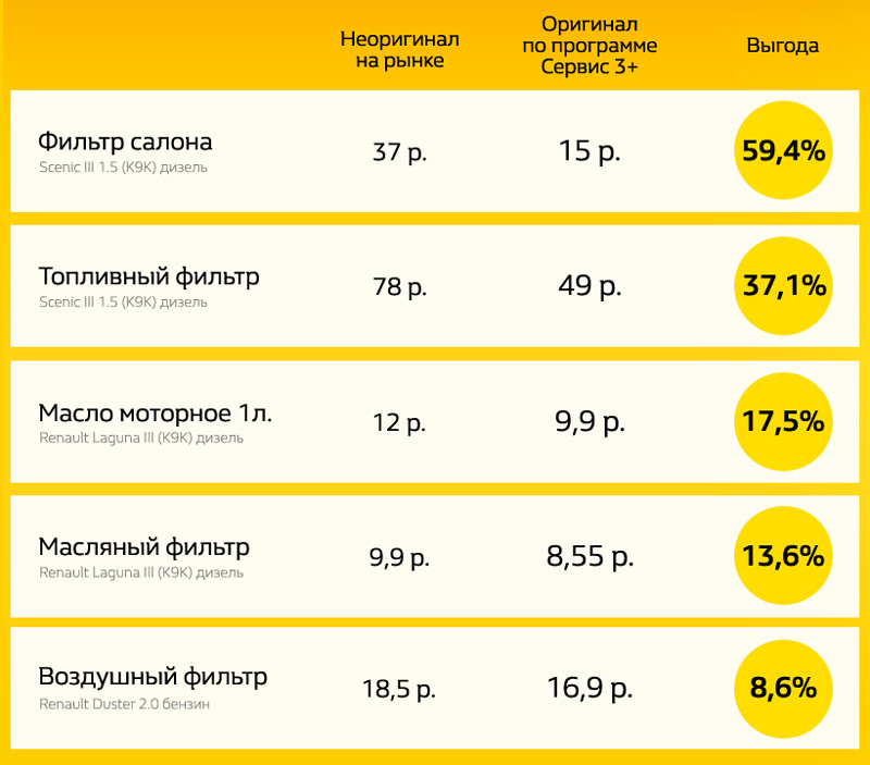 Эксперты компании Renault изучили запросы клиентов и отобрали самые востребованные запасные части для автомобилей Renault в послегарантийный период. Результатом стало создание специальной программы от производителя «СЕРВИС 3+», в рамках которой оригинальные запчасти можно купить по сопоставимой цене, а иногда и выгоднее неоригинальных деталей, доступных на рынке.