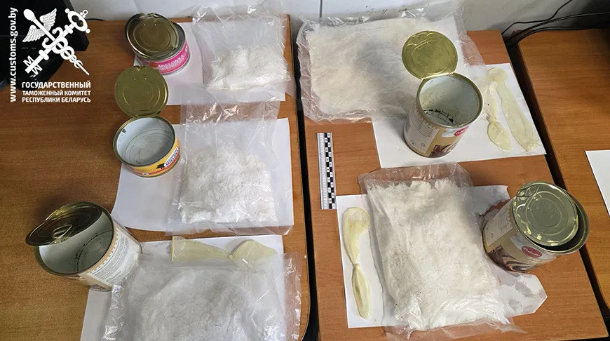 Брестские таможенники пресекли ввоз более 2,3 кг мефедрона, который перемещали в жестяных банках с этикетками консервированной продукции.