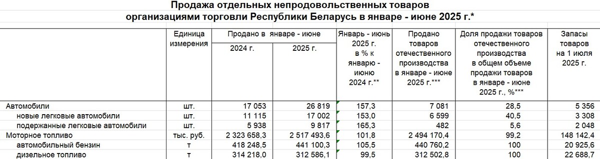 Национальный статистический комитет опубликовал данные о том, сколько машин и топлива продали организации торговли в первом полугодии 2025 года. Согласно данным ведомства, наблюдается немалый рост по сравнению с этим же периодом 2024-го.