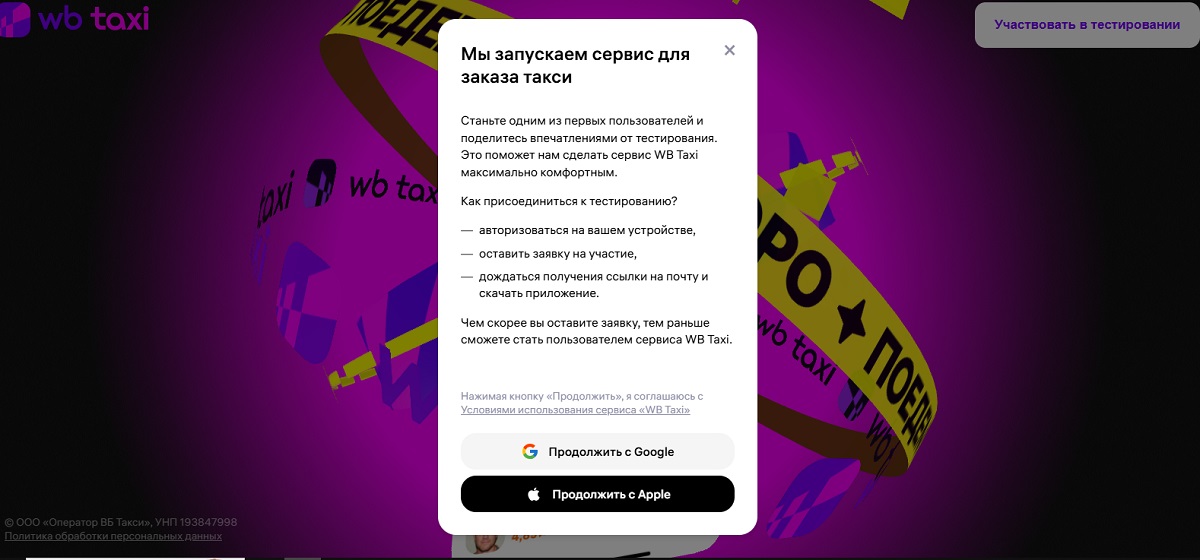 Маркейтплейс Wildberries предлагает белорусам протестировать новый сервис заказа такси. Фото: скриншот с сайта сервиса