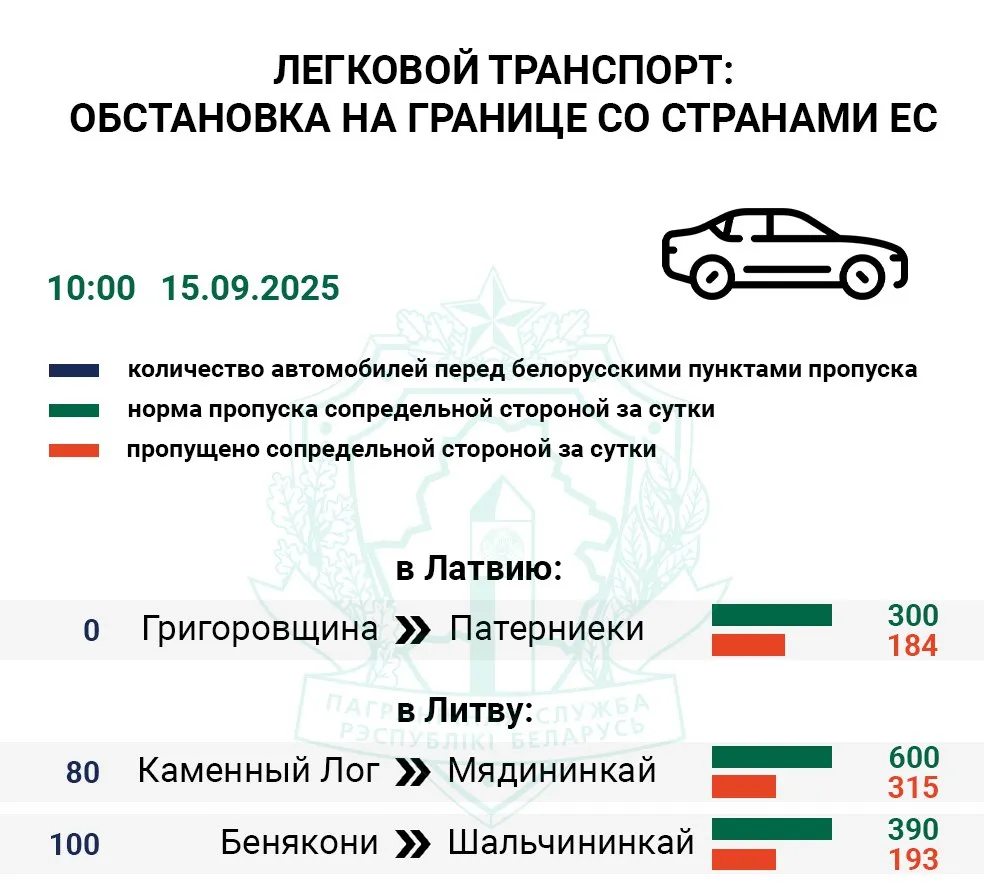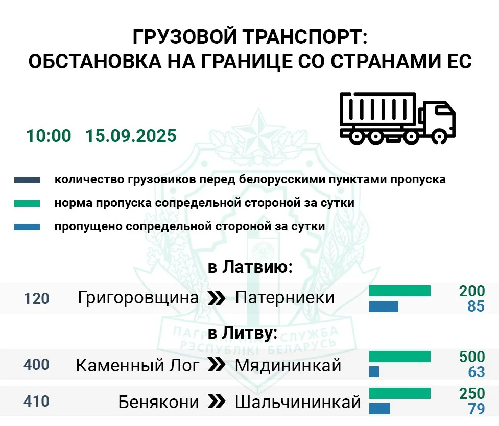 По состоянию на 10:00 наибольшая очередь грузового транспорта фиксируется на въезд в Литву. Перед пунктами пропуска Мядининкай (Каменный Лог) и Шальчининкай (Бенякони) находится 810 фур. Сопредельная сторона с пятницы приняла на свою территорию 22% и 30% грузовиков от нормы соответственно.