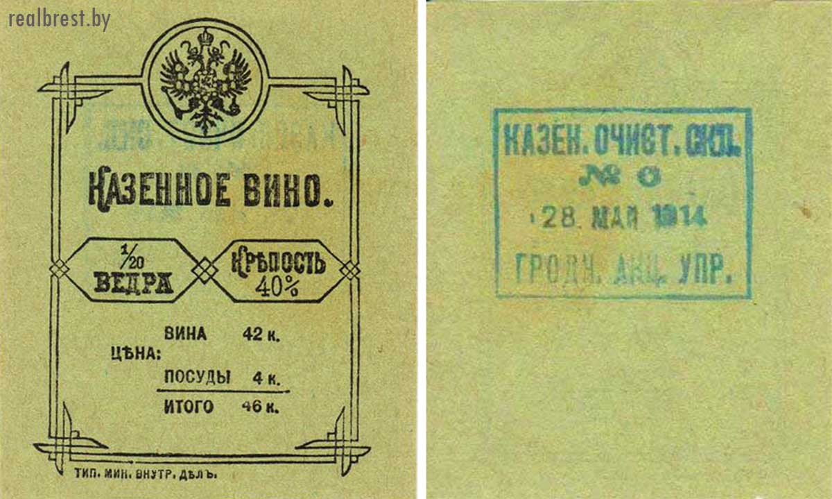 Спиртное реализовывалось в казенных винных лавках, которых к 1899 году в Брест-Литовске и его округе насчитывалось 58. Так же продукцию Винного склада закупало военное ведомство для нужд Брест-Литовского крепостного гарнизона. До революции в царской армии «хлебное вино» выдавали не только в военное, но и в мирное время. Была даже уставная команда «К чарке». В военное время его полагалось отпускать строевым нижним чинам по одной чарке (160 г) три раза в неделю, нестроевым — по две чарки в неделю. В мирное время — только по праздникам и «по усмотренью командира для поддержания здоровья, в ненастье, после продолжительных маршей, учений и парадов». Церемония «представления к чарке» проходила официально, торжественно, перед строем. В 1909 году эту традицию упразднили.