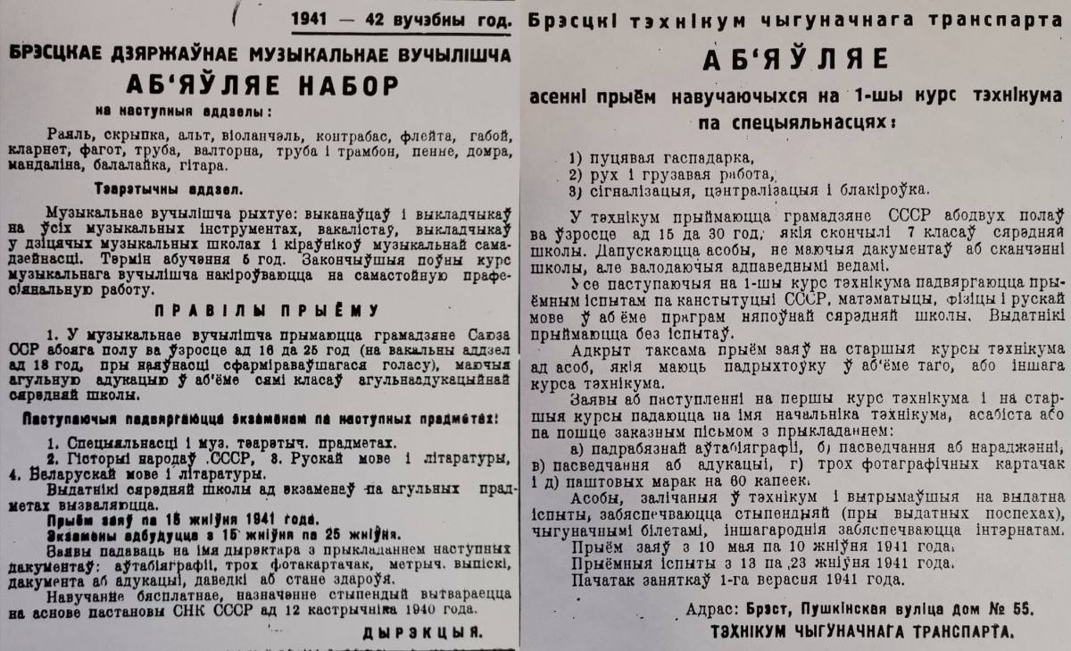 Поделюсь интересными фото двух архивных объявлений 1941 года о начале вступительных кампаний в Брестское государственное музыкальное училище и Брестский техникум железнодорожного транспорта.
